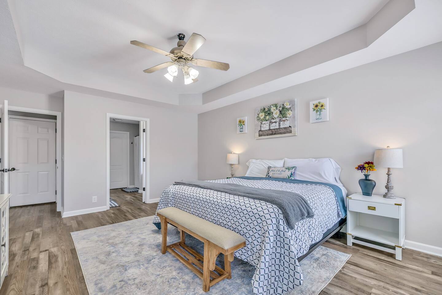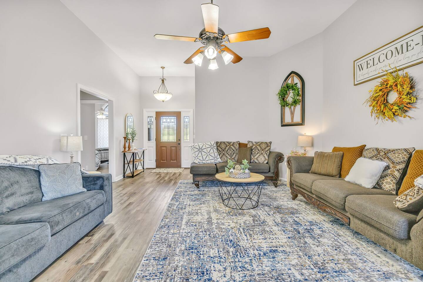 This is a large home equipped with all you need for a comfortable stay. There are three bedrooms and 2.5 baths on the ground floor. The second floor has a fourth bedroom in the loft area. You will have two dining areas, a large table in the kitchen that seats 8 and a table that seats 4 in the dining room. This room can also be used as a work area. The pool area has many chairs for use, and the chairs can be used to enjoy the large patio. You have 8 acres of land you can enjoy. The yard is not fully fenced-in.