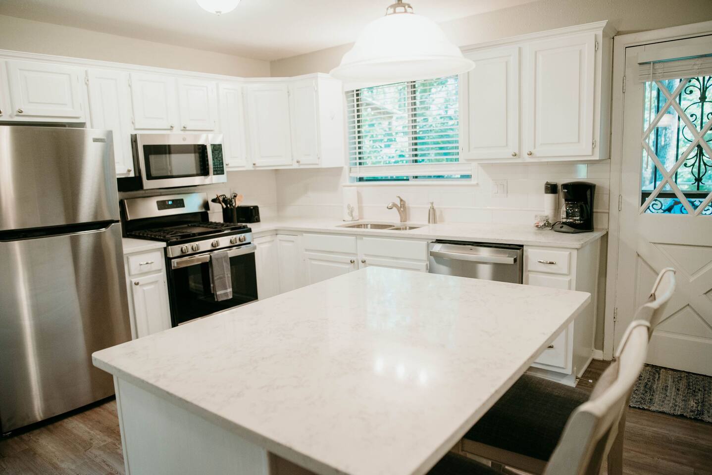 When you walk into this newley remodeled home, you will find all new furnishings. This is a split level with just a few steps leading up to the bedrooms and bathrooms, while a few steps down leads to the garage. There is a formal living room off of the dining area. You will find a second living area with couches and chairs surrounding the fireplace. The kitchen is large with all stainless appliance and granite counter tops. You have bar stools to eat and visit at the kitchen counter. When you walk out back, you will find a deck with a dining area and chairs for lounging that overlooks the yard. Go down a few steps and you will enter a large garage with a laundry area, perfect for parking most any vehicle. A few steps up from the living room, you will find three large bedrooms, with dressers and closets. There are two full-sized bathrooms, one for the master suite and the other you will find in the main hallway.