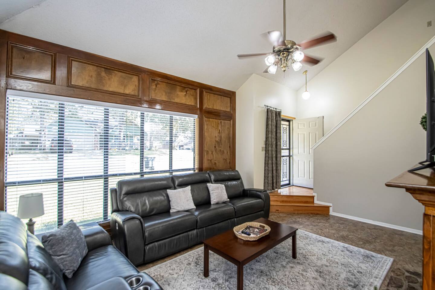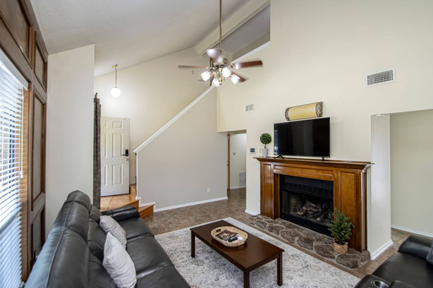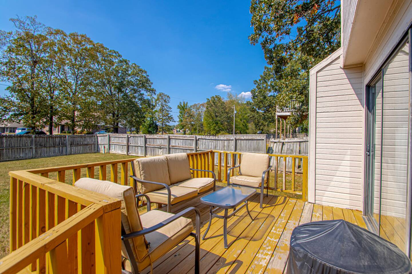 You will have a private driveway with an large two-garage making this perfect for a long stay. The home is fully equipped to ensure you will have all you need for your visit. This is a two-story home. The upstairs has a huge master, with two additional bedrooms with two bathrooms. The downstairs has a nice living room with another half bathroom. You walk outside to a nice deck that overlooks a huge fenced in yard for your furry friends. All the amenities are available for a peaceful stay to include: *All kitchen dishware, appliances and tools needed to cook or entertain on the backyard deck. *High-speed Internet *Private master bathroom, with two additional bathrooms *Soaps and shampoos *Extra linens *Ironing board *Hair dryer *Plenty of seating in the living room with a kitchen table that seats six *Patio furniture *Fenced in yard *Washer and dryer *Smart TVs in living room and master bedroom